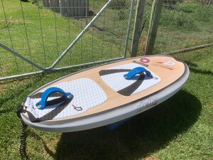 This board is a knee starter so Dreu can have a safety margin for outer reef surfing where he doesnt want to compromise his riding by worrying about a fall and having to ride overpowered all the time to assure a deep water start. The light weight means there is a more direct connection to the foil ....almost the same as his prone board .