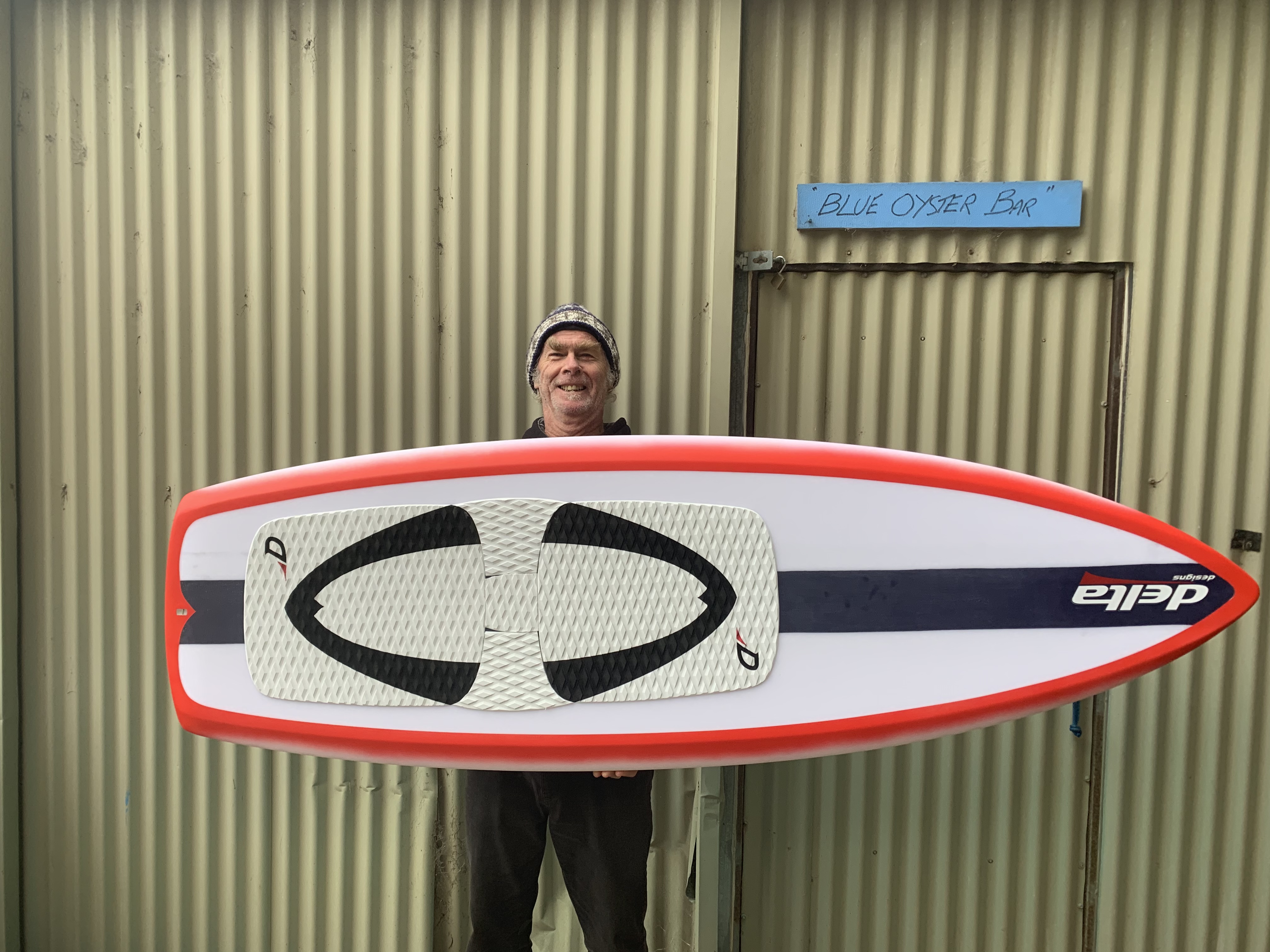 This board is a knee starter so Dreu can have a safety margin for outer reef surfing where he doesnt want to compromise his riding by worrying about a fall and having to ride overpowered all the time to assure a deep water start. The light weight means there is a more direct connection to the foil ....almost the same as his prone board .